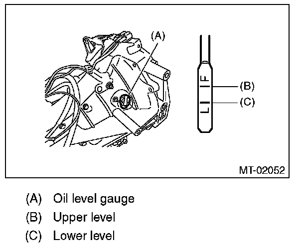 5) Reinsert the oil level gauge all the way. Be sure that the oil level gauge is correctly inserted in the proper direction.