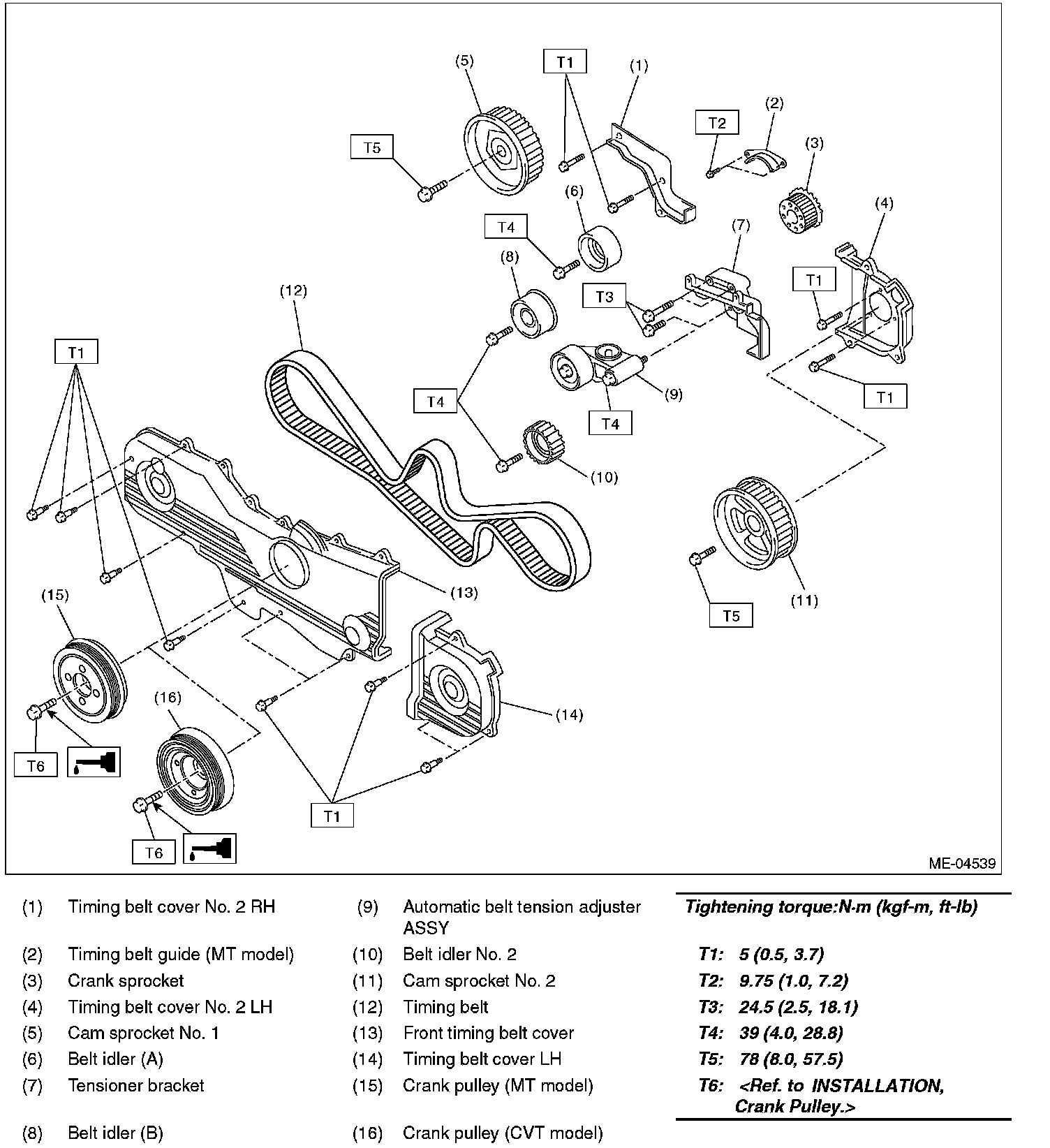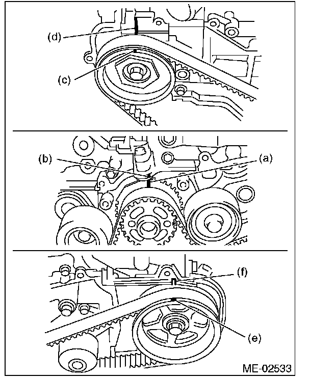 (1) Use the ST to turn crankshaft. Align the mark (a) of sprocket to the mark (b) of oil pump, and then ensure the right side cam sprocket mark (c), cam cap and cylinder head matching surface (d) or left side cam sprocket mark (e), timing belt cover notch (f) are properly adjusted.