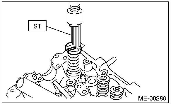 (1) Place the cylinder head on ST1 with the combustion chamber upward so that valve guides fit the holes in ST1.