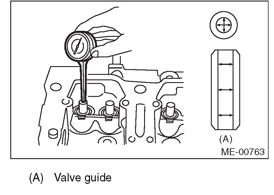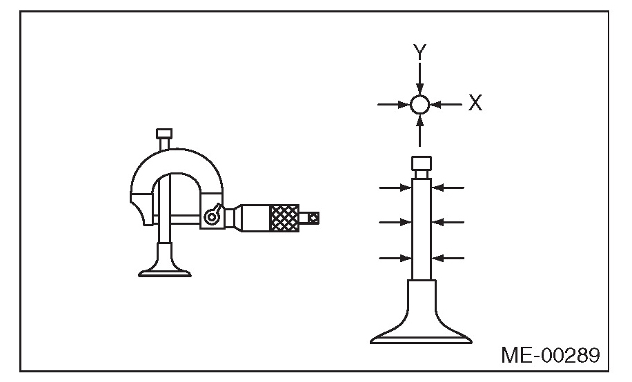 1) Check the clearance between valve guide and valve stem. The clearance can be checked by measuring respectively the outer diameter of valve stem with a micrometer and the inner diameter of valve guide with a caliper gauge.