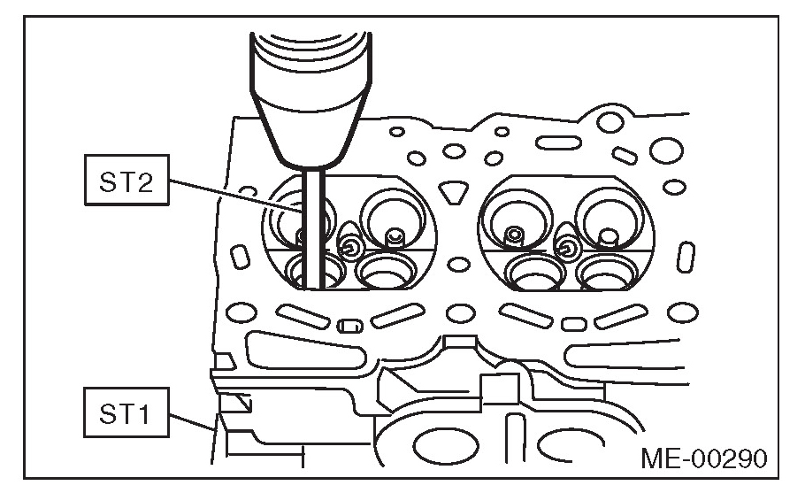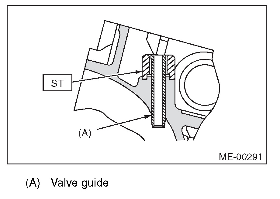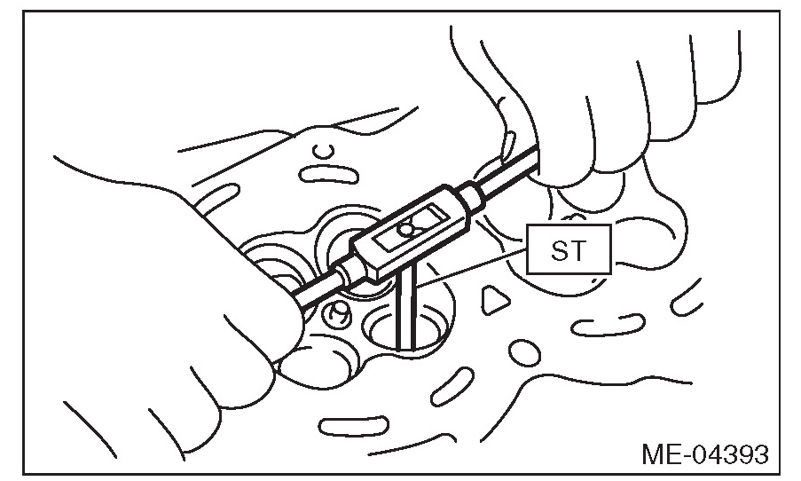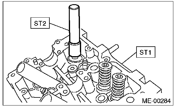 (5) Put a new valve guide, coated with sufficient oil, in the cylinder head, and insert the ST1 into valve guide. Press in until the valve guide upper end is flush with the upper surface of ST2.