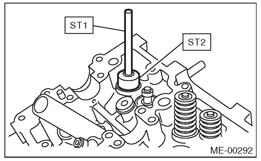 2) Place the cylinder head on ST1, and use ST2 to press-fit the oil seal.