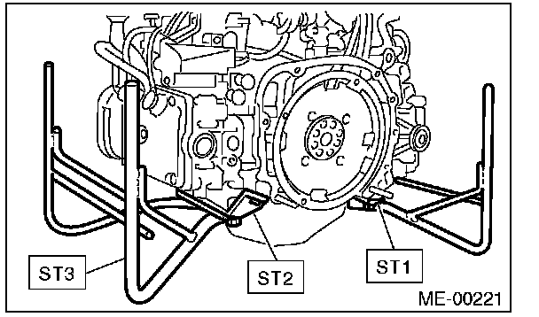 1) After removing the engine from vehicle body, attach the ST to the engine as shown in the figure.