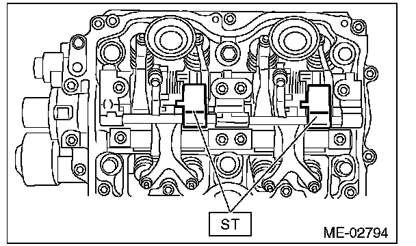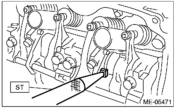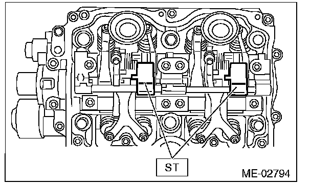 ^ Set the ST in the position shown in the drawing to mount the intake valve rocker assembly.