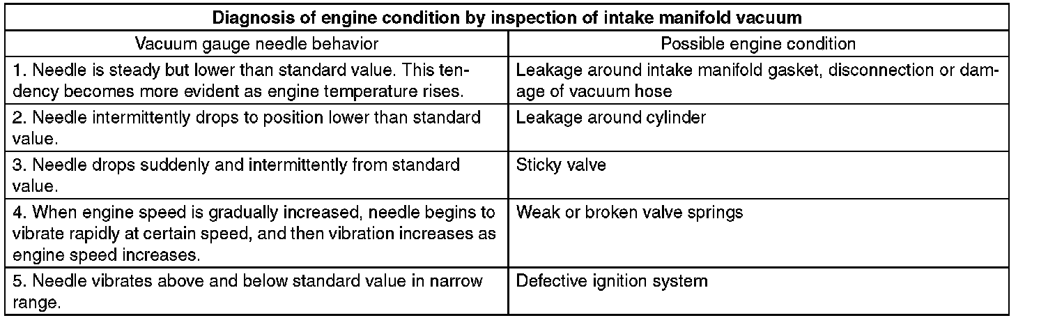 Condition of engine inside can be diagnosed by observing the behavior of the vacuum gauge needle as described in table below.