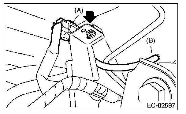 5. Pull out the vacuum hose (B) from vehicle.