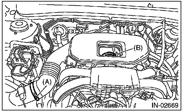 2) Remove the cover (A) and clip (B) from air intake boot assembly.