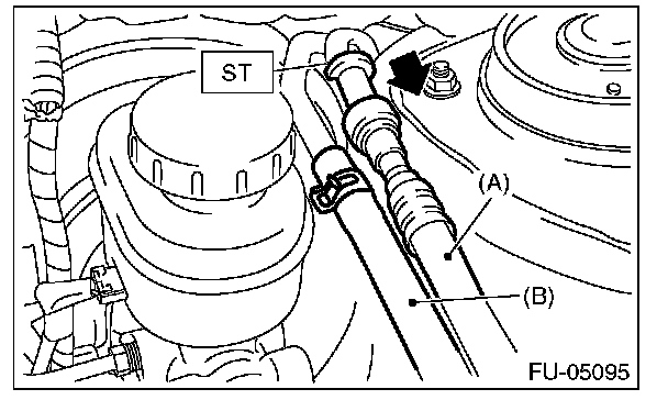 4. In the engine compartment, disconnect the fuel delivery hoses (A) and evaporation hose (B).