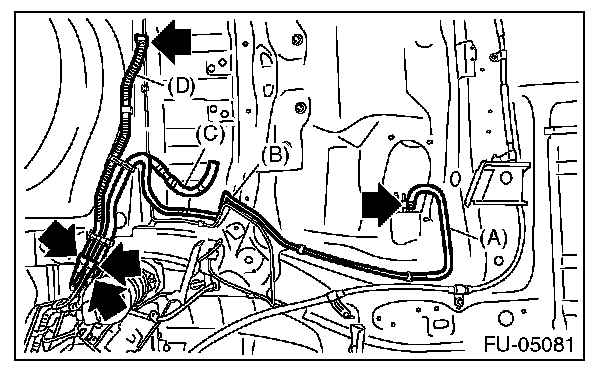 7. Remove the purge hose (A), purge pipe vent hose (C) and drain tube assembly (D).