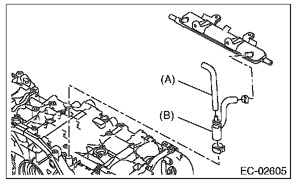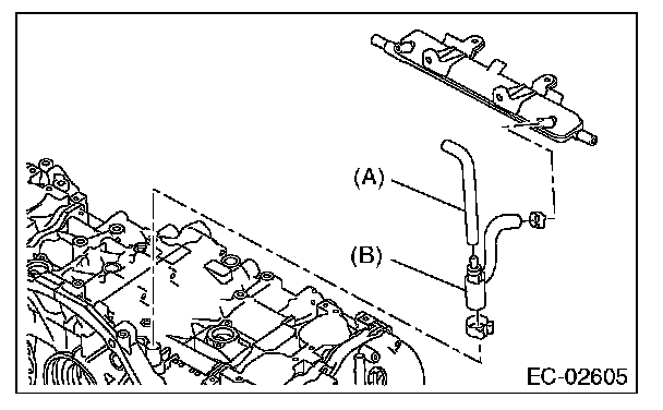 1. Install the PCV hose assembly (B) to the cylinder block RH and PCV pipe, and then connect the vacuum hose (A) to the PCV valve.