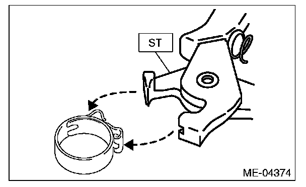 NOTE: Use a new clamp for the PCV hose assembly (B), fit the cut out in the ST with the protrusion on the clamp as shown in the figure, and lock the clamp.