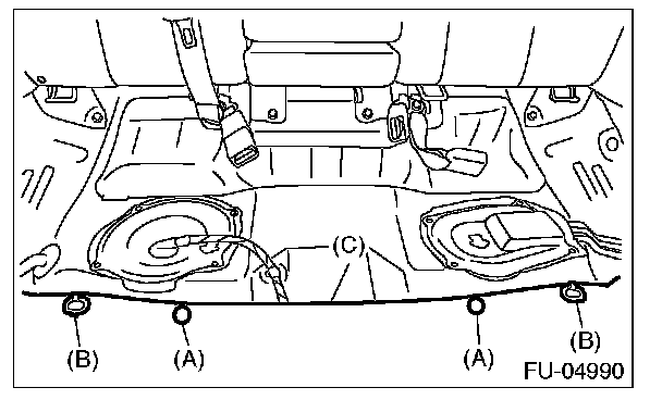 5. Remove the clips (A) and seat cushion hooks (B), and turn over the floor mat (C).