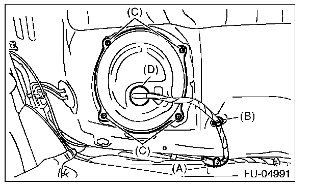 3. Push the grommet (D) down and remove the service hole cover.