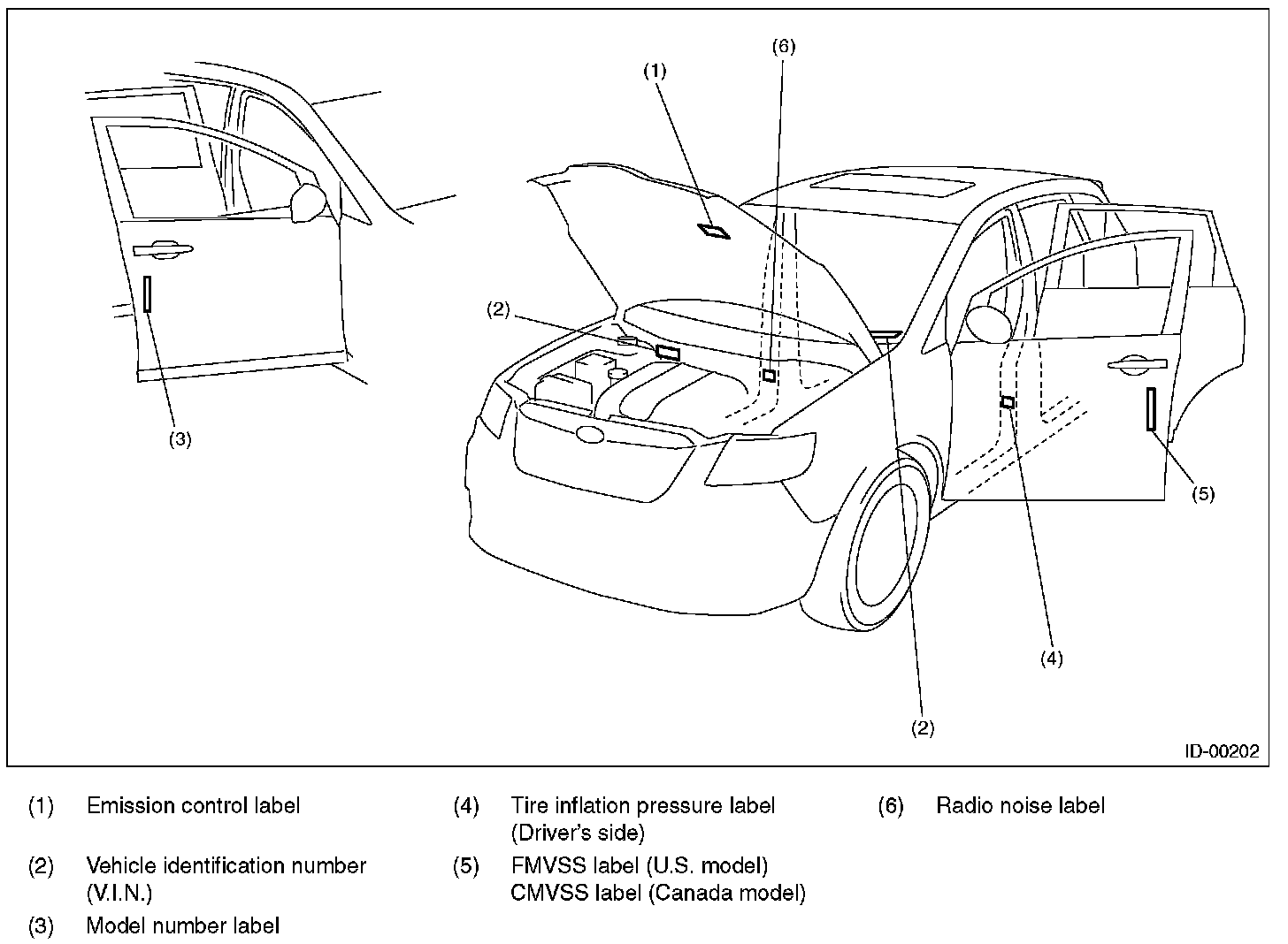 The model number label indicates the type, V.I.N, applied model, option code, trim code, engine type, transmission type and the exterior color code. This information is helpful when placing orders for parts.