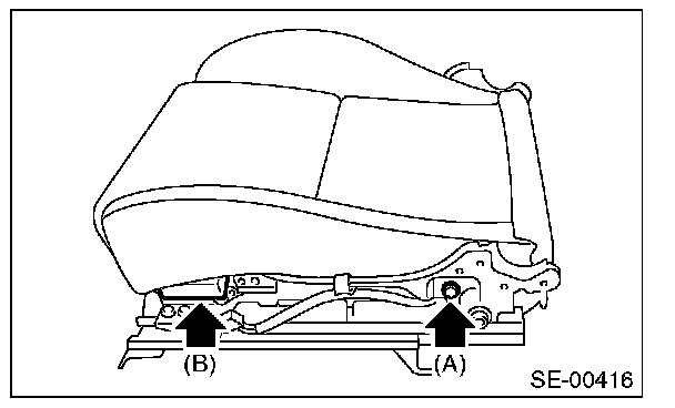 18. Remove the bolt (A) and hook (B) on the left and right side, and then remove the seat cushion frame from seat rail assembly.