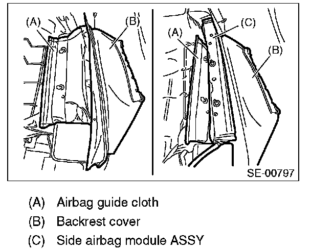 Besides, if the backrest cover is not installed securely, the side airbag module may not be deployed properly, therefore keep strictly to the following procedures.
