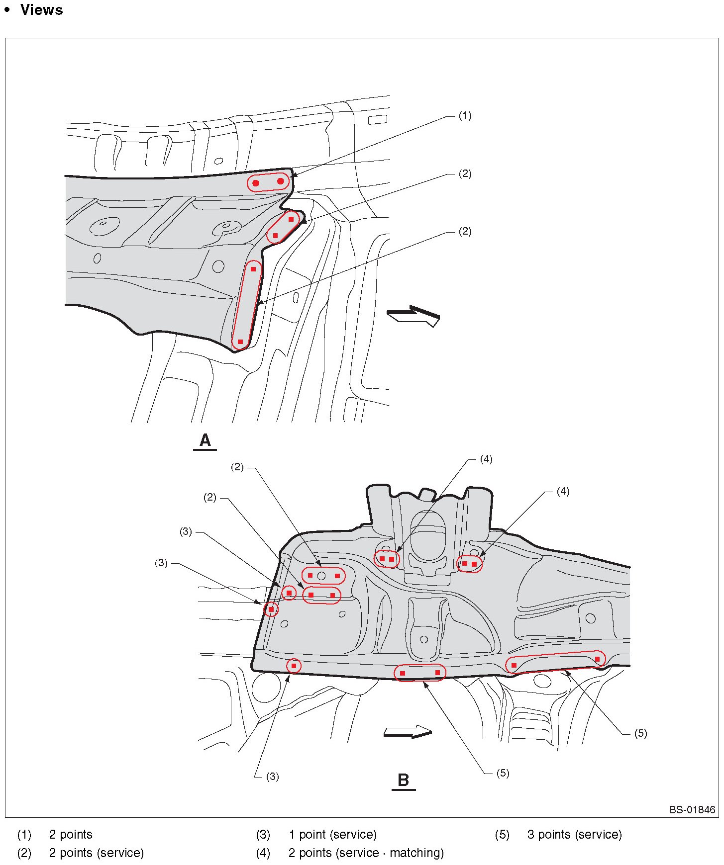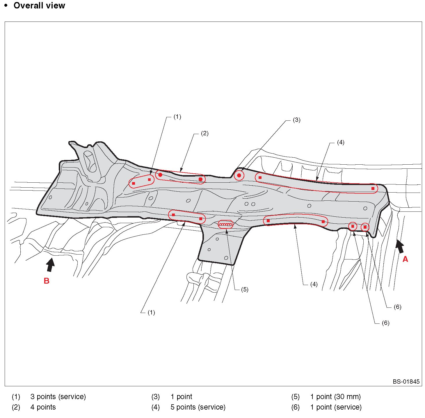 - Symbols and number of points indicate the welding method and the number of welding points. Text in brackets indicate the direction of removal for welded parts, and numbers indicate the number of panels to be drilled to remove welded sections of panels.