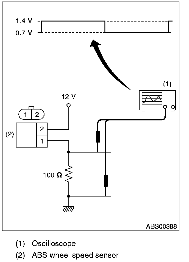 2) Connect a 12 V power supply to No. 2 terminal of sensor connector as shown in the figure, then attach resistance to the No. 1 terminal. Rotate the wheel at about 2.75 km/h (2 MPH), and measure the voltage using an oscilloscope.