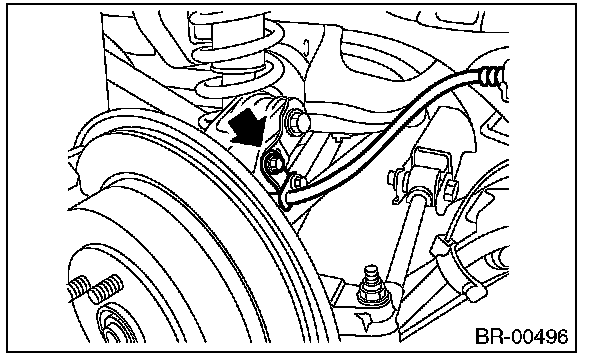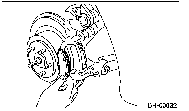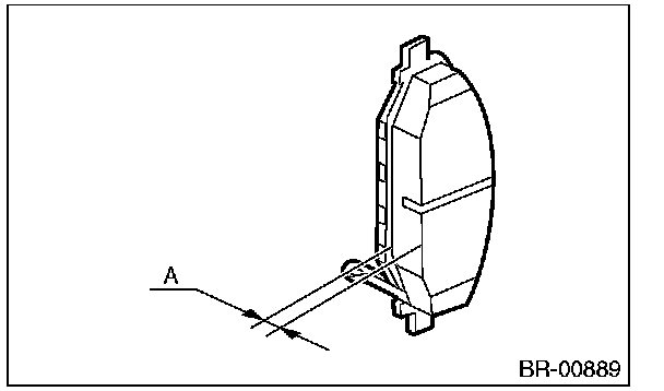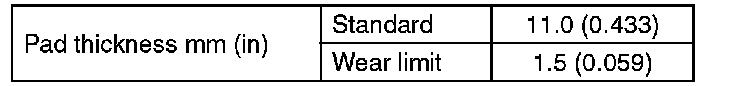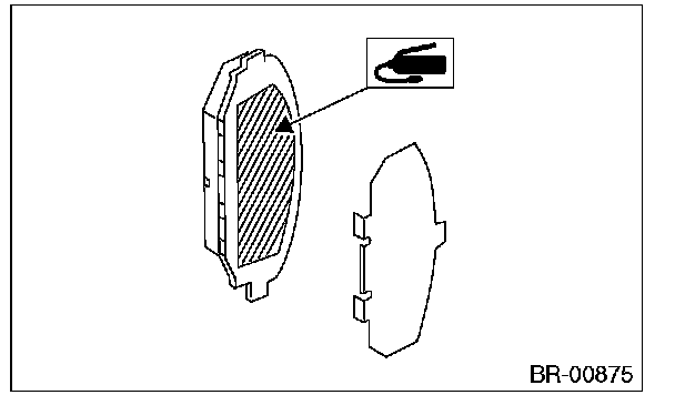 ^ A wear indicator is installed on the inner disc brake pad. If the pad is worn to the limit, the end of wear indicator contacts disc rotor, and a squeaking sound is heard as the wheel rotates. If the sound is heard, replace the pad.