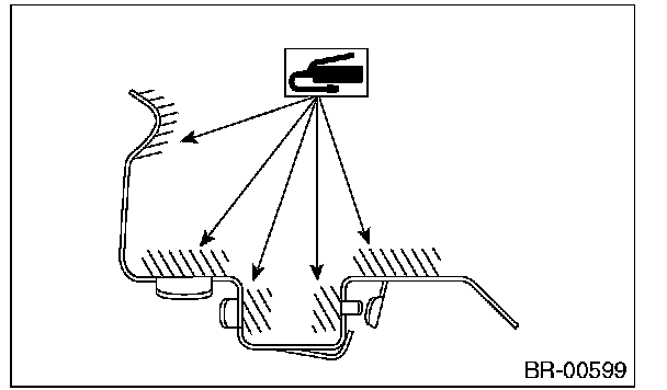 2) Apply a thin coat of Molykote AS880N (Part No. K0777YA010) or the grease contained in the pad kit to the contact surface between the outer-side pad and shim.