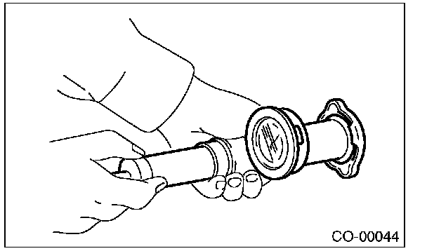 3) Remove the radiator cap, fill the radiator with engine coolant, and then install the radiator cap tester to the filler neck of radiator.