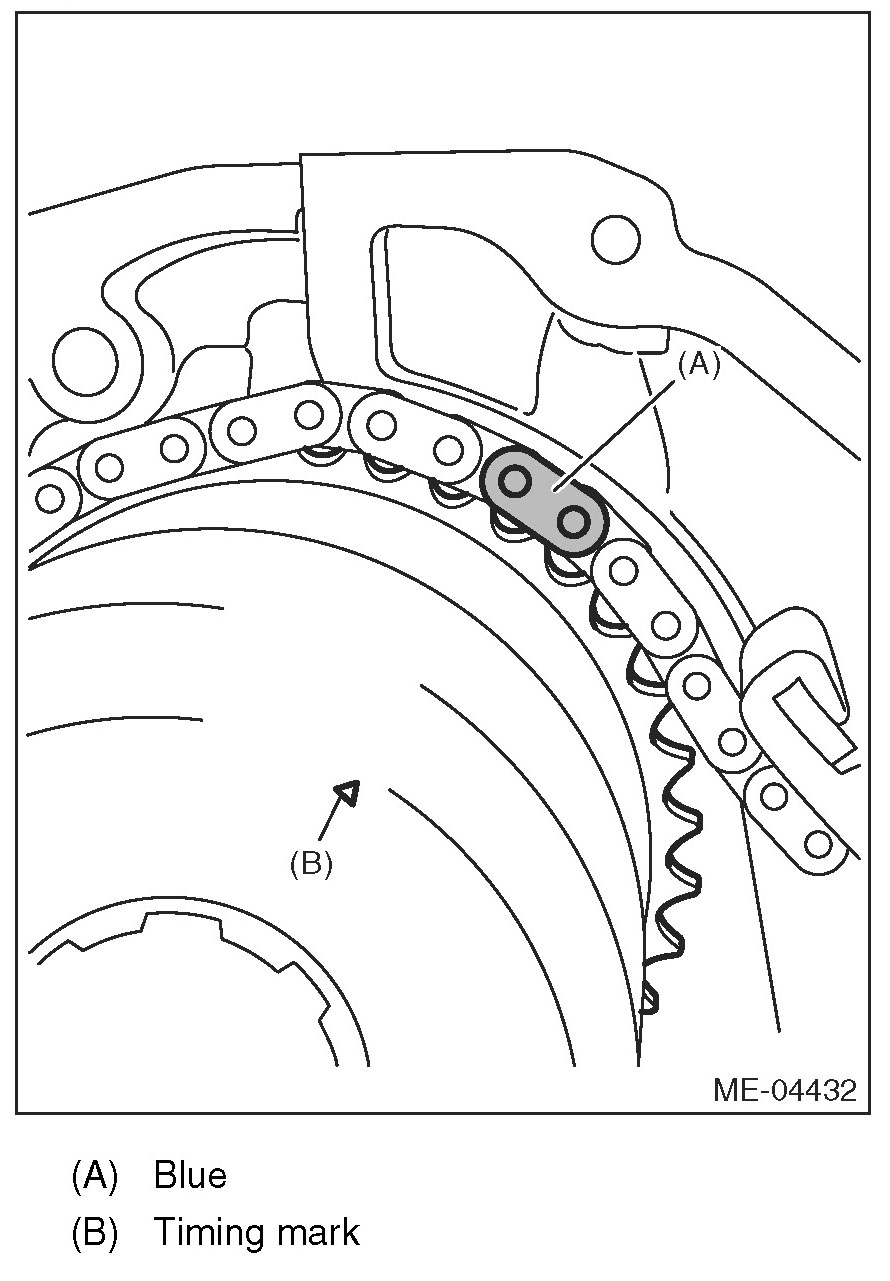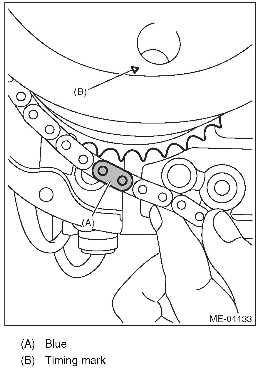 (3) Make sure that the LH side cam sprocket timing mark is aligned to the timing chain mark (blue).