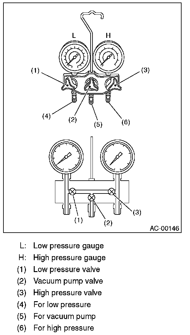4. Operate the vacuum pump and open the low pressure and high pressure side valves. Next, open the center manifold hose valve, and begin evacuation.