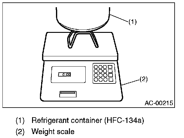 11. When a 13.6 kg (30 lb) refrigerant container is used, measure the amount of refrigerant with a refrigerant charging scale, and connect with the center manifold hose.