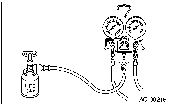 18. If the HFC-134a supply container becomes empty, close all valves, and close the can tap valve to replace the empty container. After replacing with a new HFC-134a supply container, perform air purge, and resume the filling operation.