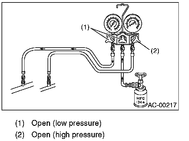 CAUTION: When filling with the engine running, do not open the high pressure side valve.