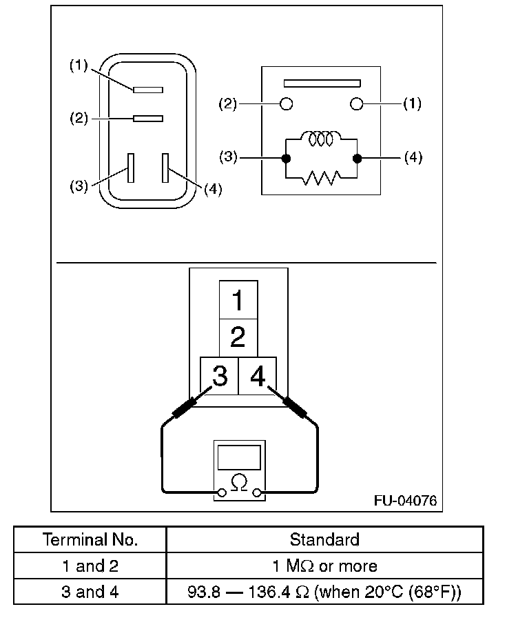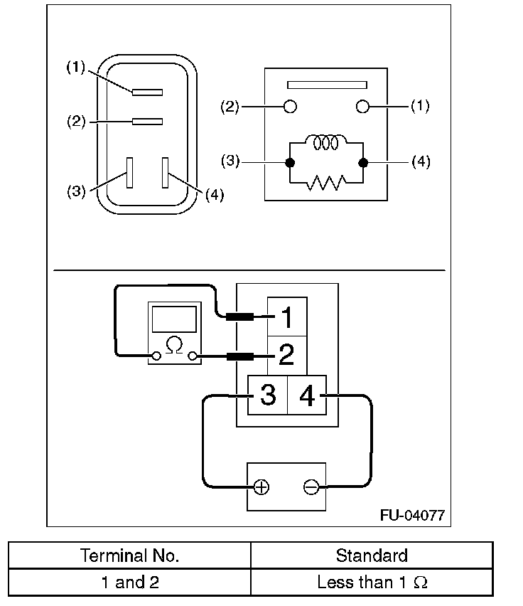 3. Connect battery positive terminal to terminal No. 3 and battery ground terminal to terminal No. 4, and measure the resistance between the electronic throttle control relay terminals.
