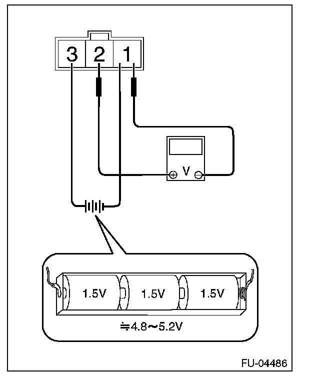 2. Connect dry-cell battery positive terminal to terminal No. 3 and dry-cell battery ground terminal to terminal No. 1, circuit tester positive terminal to terminal No. 2 and the circuit tester negative terminal to terminal No. 1.