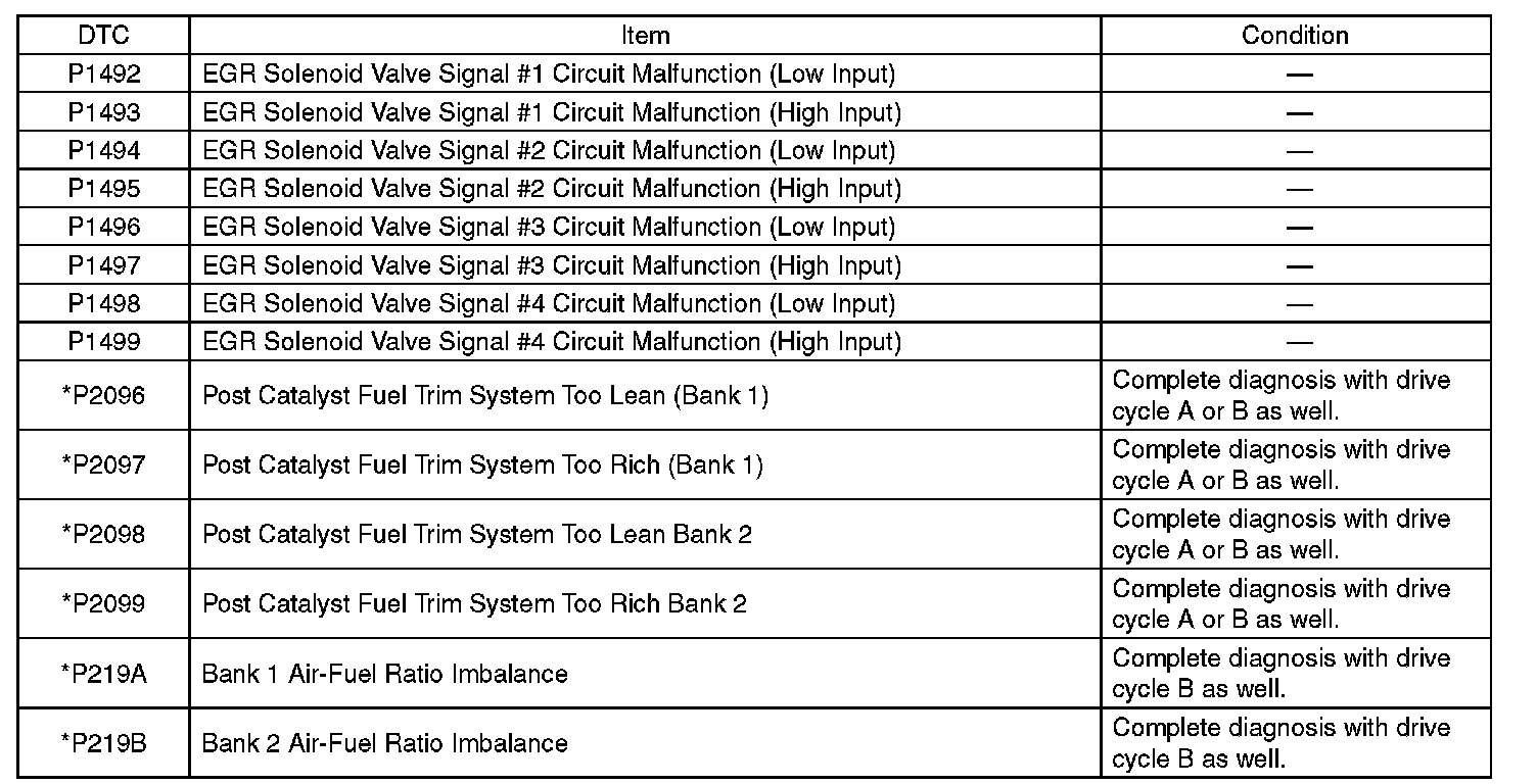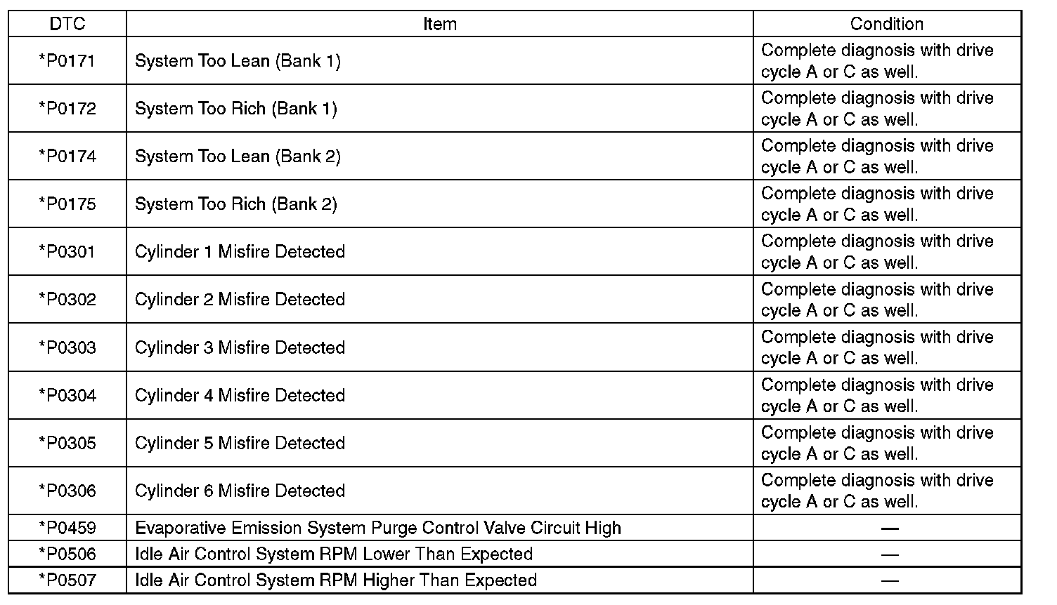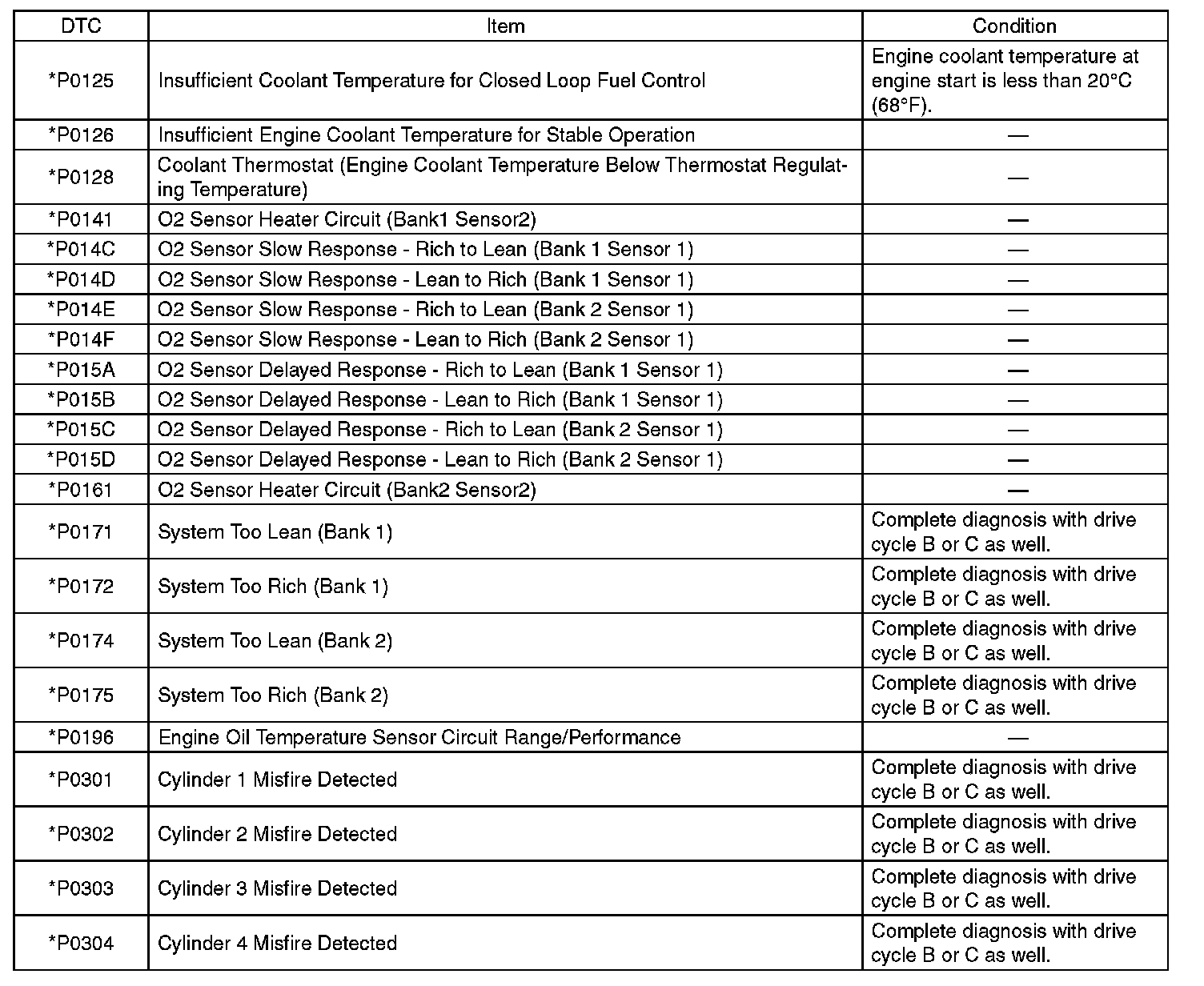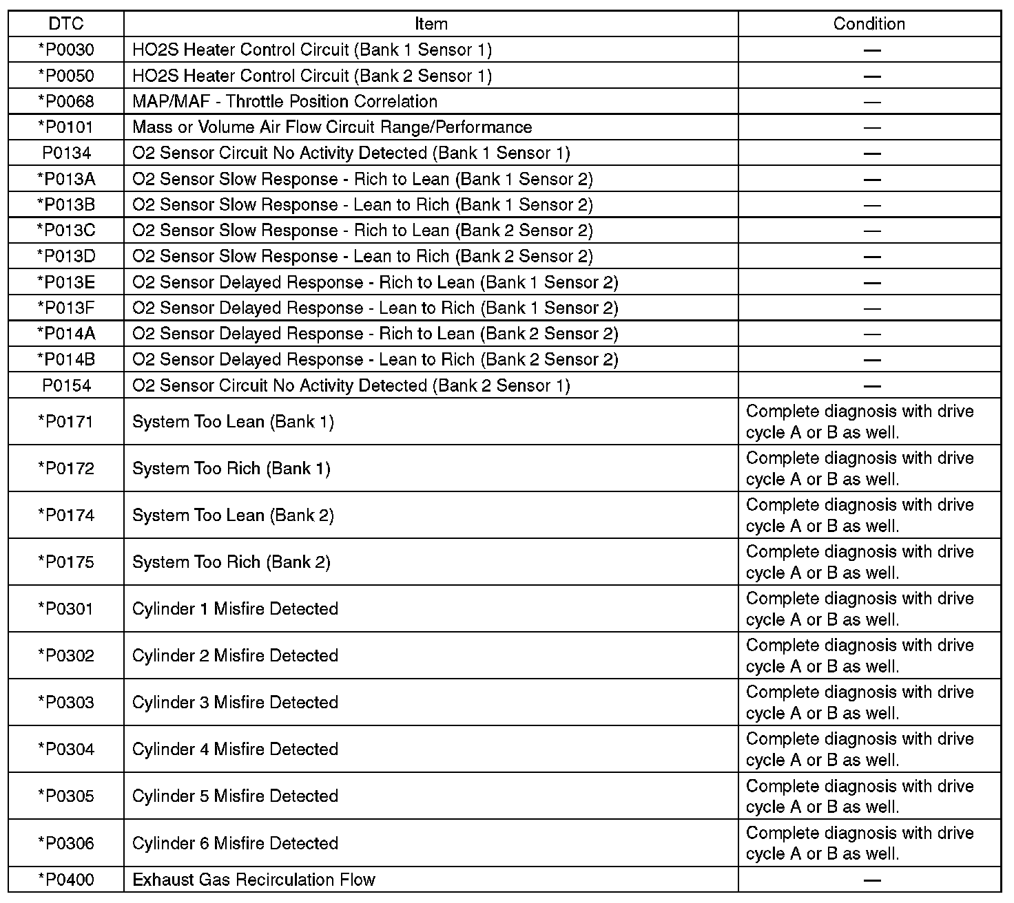 - Perform the drive cycle twice if the DTC in the list is marked with *. After completing the first drive cycle, stop the engine and perform second diagnosis in same condition.