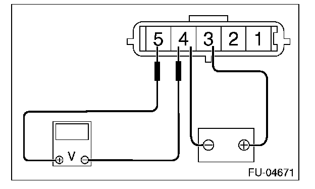 1. Connect the battery positive terminal to terminal No. 3 and the battery ground terminal to terminal No. 4, the circuit tester positive terminal to terminal No. 5 and the circuit tester ground terminal to terminal No. 4.