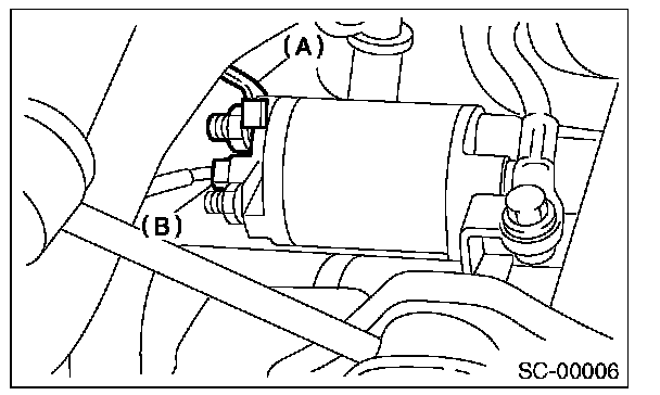 8. Disconnect the connector (B) and terminal (A) from starter.