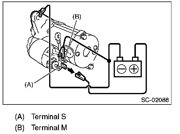 With terminal S connected to the positive terminal, and terminal M and starter body connected to the battery ground terminal to suction the main contact point, check that the pinion gear returns to its original position when terminal S is disconnected.