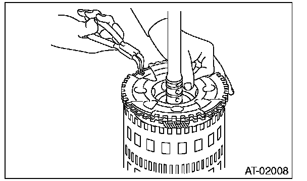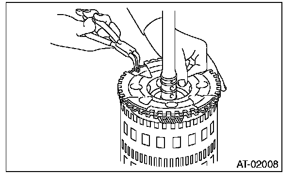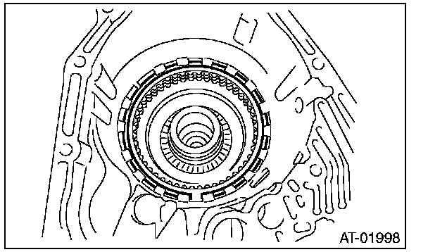 Measure the clearance "L" between snap ring and retaining plate using a thickness gauge. If it is out of specification, replace the entire direct clutch assembly.