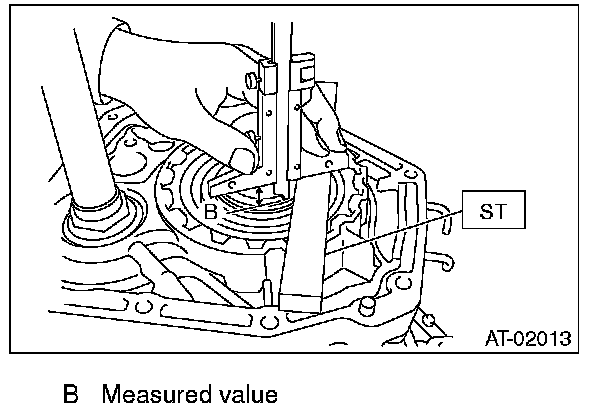 2) Using the ST, measure the depth "B" from the convex surface of oil pump cover to thrust bearing transferring surface.