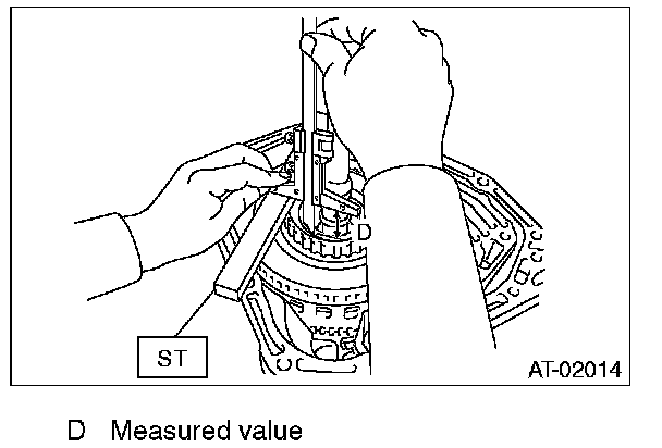 4) Using the ST, measure the depth "D" from the AT main case mating surface to thrust bearing transferring surface of front sun gear.