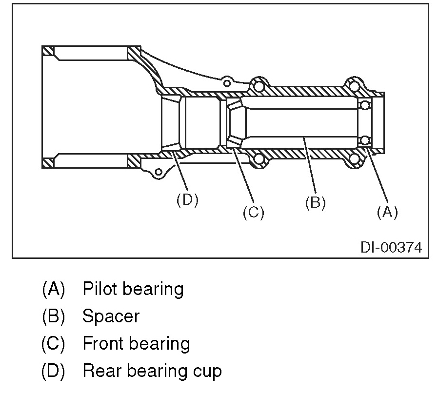 21) Remove the pilot bearing, front bearing cone and spacer.