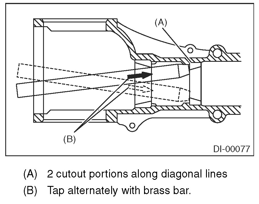 22) When replacing the bearings, use a brass bar to tap out the front bearing cup and rear bearing cup (in this order).