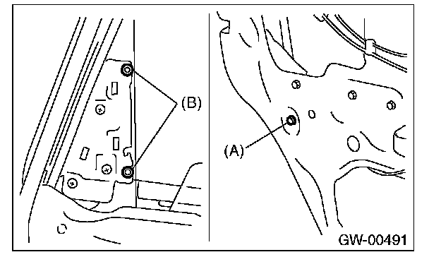 6. Remove the sash retaining bolt (A), and loosen the retaining nuts (B).