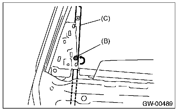 7. Move the sash (C) upward, and move the nut (B) to the position on rear door as shown in the figure.