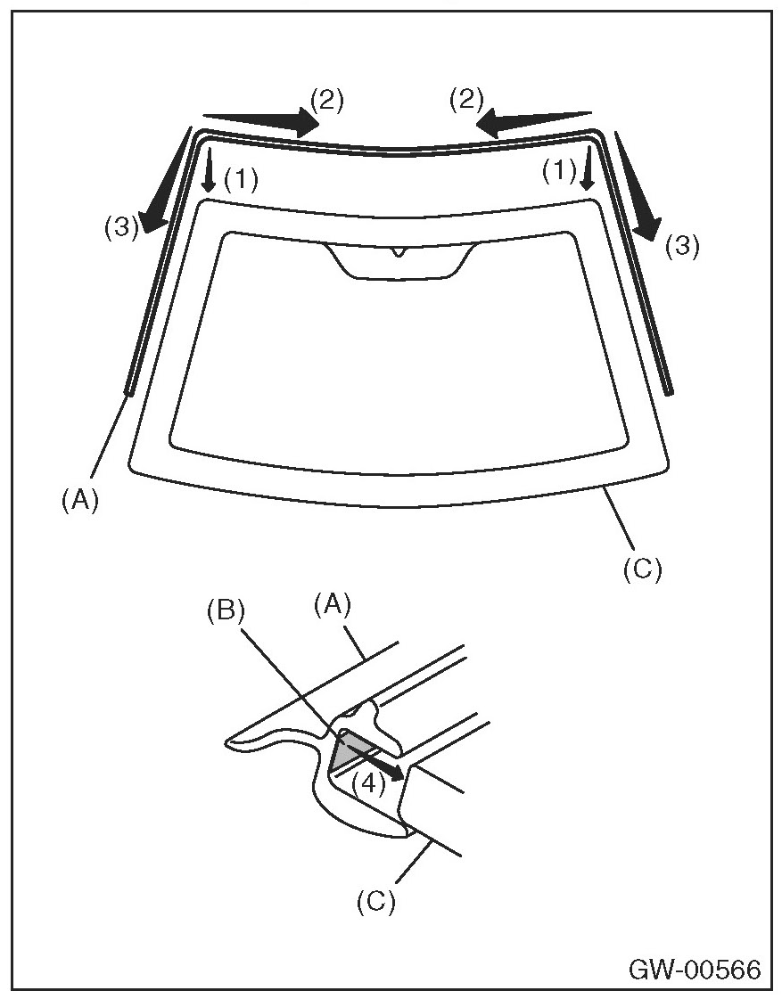 1. Align the molding (A) with both ends of the upper edge of the windshield glass (C).