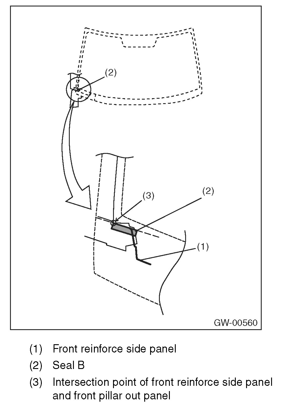 7. Apply the seal B (2) to terminal section of front reinforce side panel (1) and the intersection point (3) of front reinforce side panel and front pillar out panel.