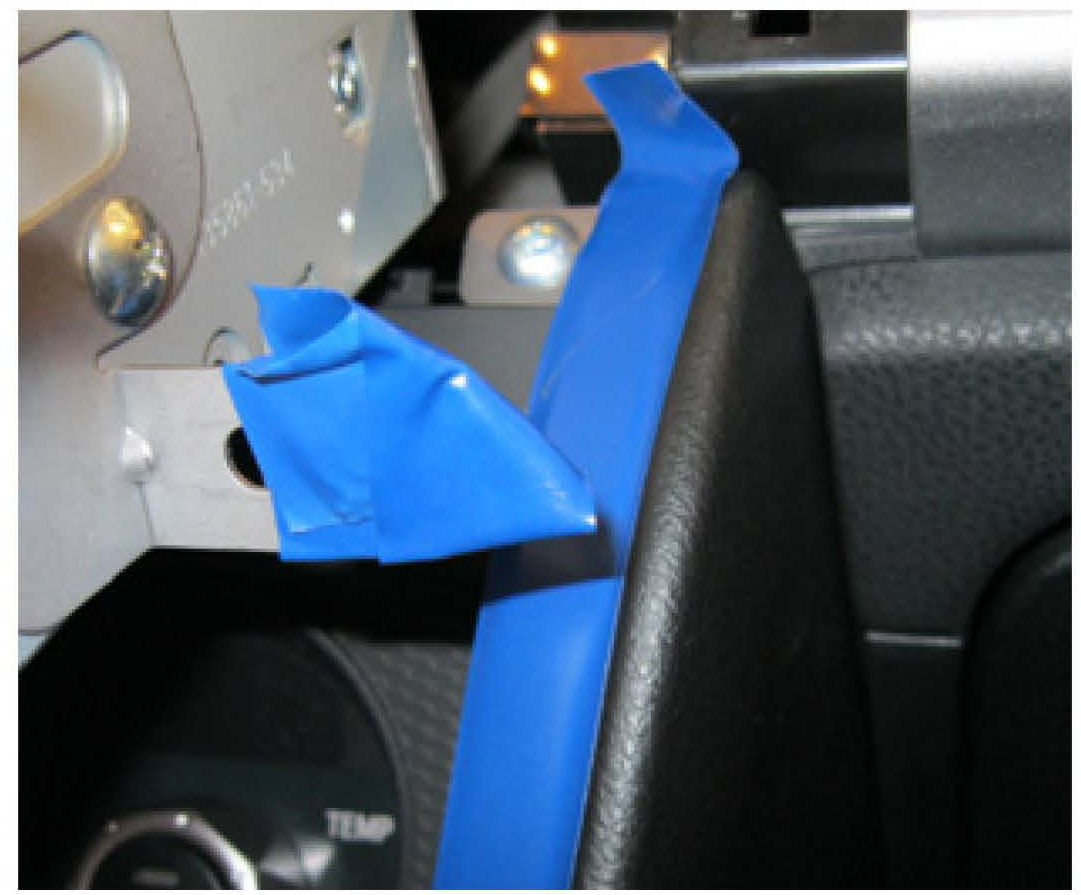 Take precautions to protect the surrounding lower dash trim pieces against possible damage from contact with the navigation / audio unit's lower mounting bracket tabs using tape as shown below. Once accessible, disconnect the harness connectors from the navigation / audio unit then remove it.