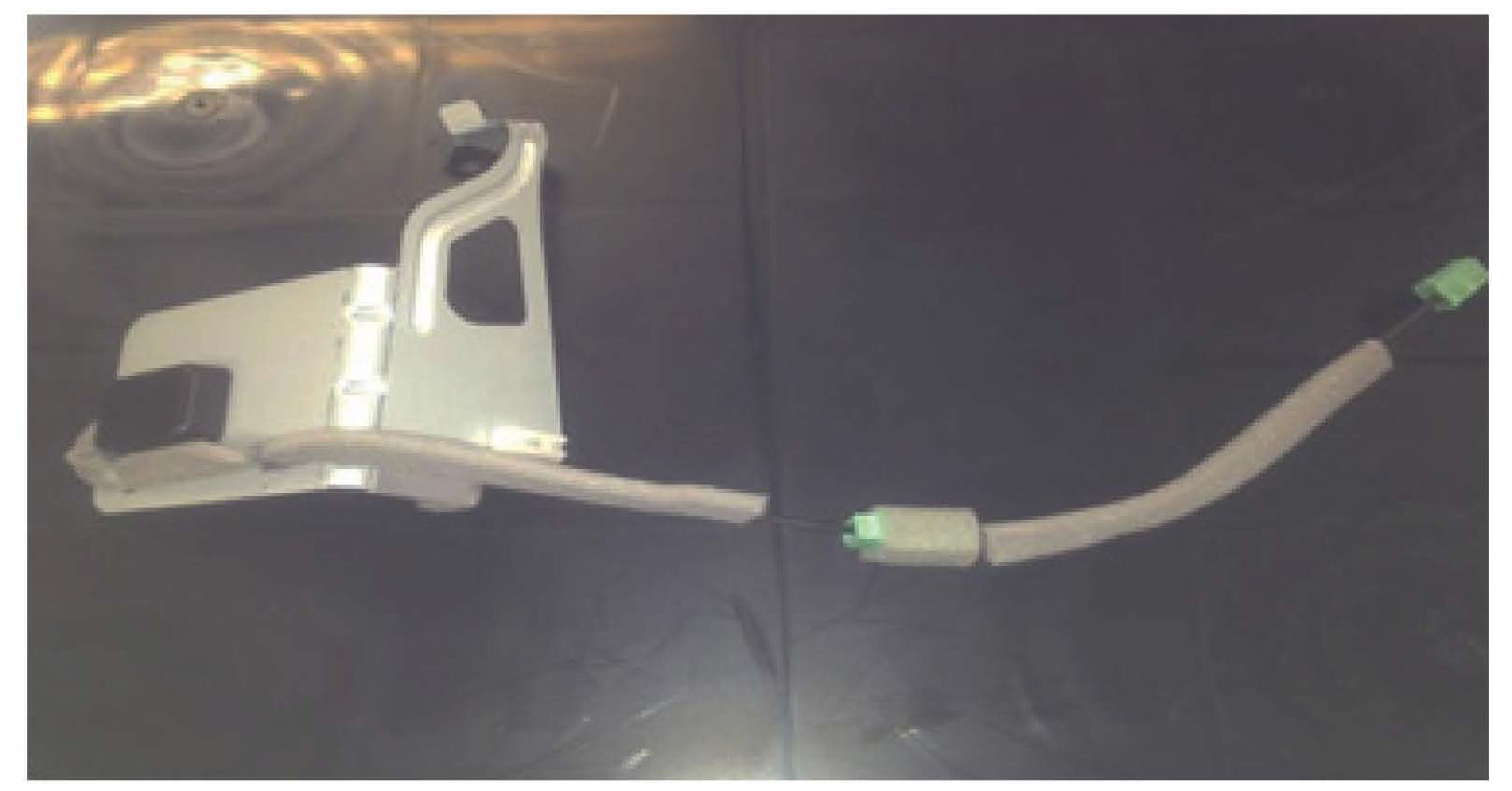 The photo shows the revised GPS antenna / mounting bracket assembly along with an antenna lead extension harness already attached. NOTE: The revised GPS antenna / mounting bracket assembly you receive may have a longer 1-piece lead instead of a shorter lead with an extension pigtail as shown in the photo. Either configuration is acceptable to use for this procedure.