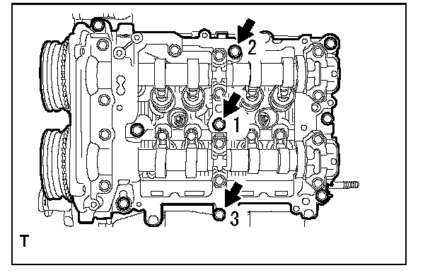 Camshaft Cap Torque and Sequence, Bank 2 Side:Tighten the 13 bolts in the order as shown in the figure and install the front camshaft cap LH, intake center camshaft cap LH, intake rear camshaft cap LH, exhaust center camshaft cap LH and exhaust rear camshaft cap LH.