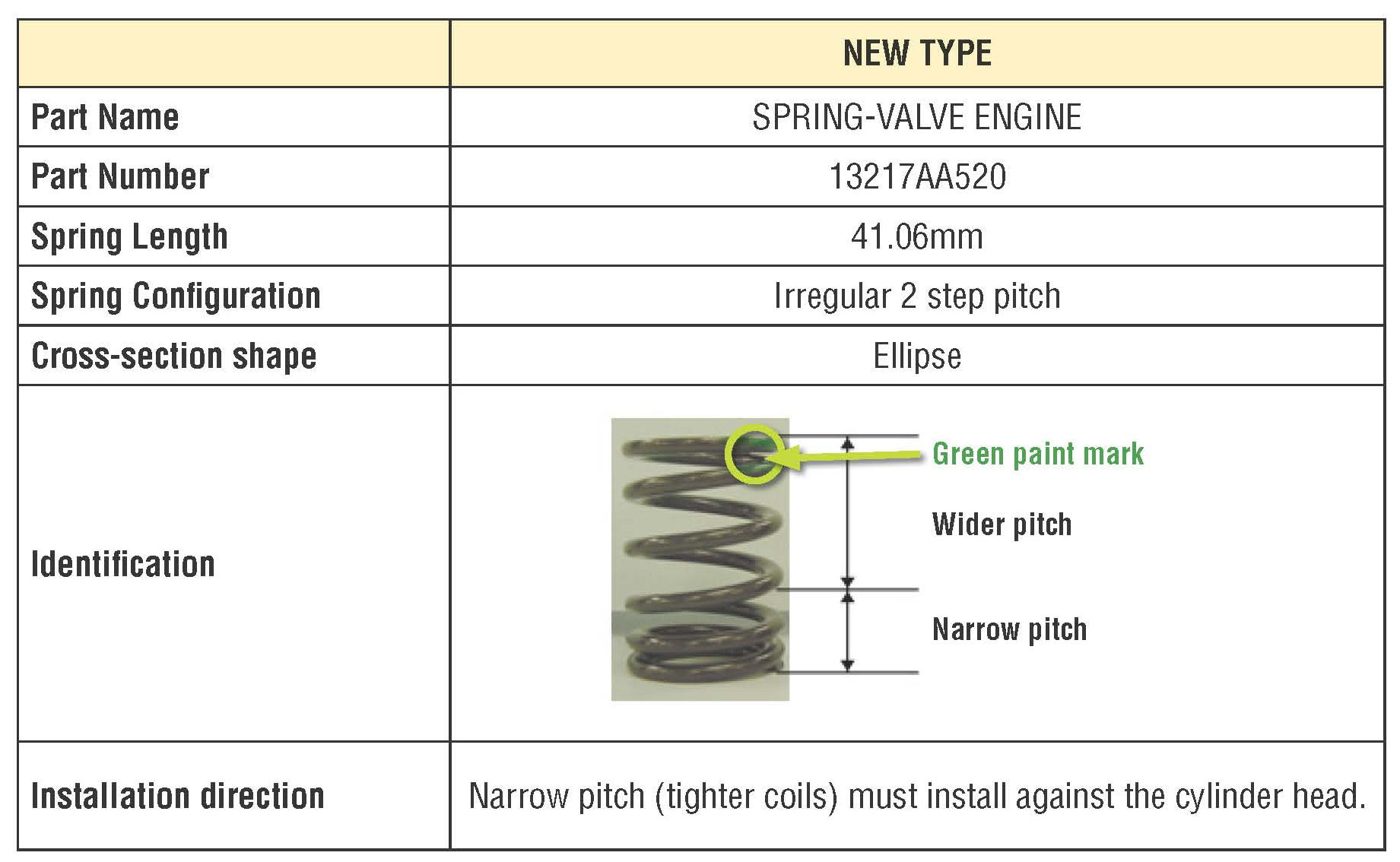 The purpose of this bulletin is to clarify the proper installation direction of the valve springs used on the FA engine. The coils are closer together at the bottom and further apart at the top (retainer) end. It is important to note the proper orientation upon installation. The springs also have a green paint mark identifier as shown in the chart below.