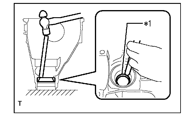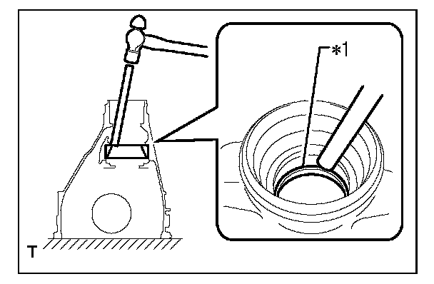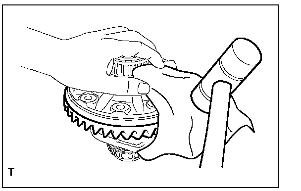 (1) Using a brass bar and a hammer, lightly and evenly tap the entire perimeter of the tapered roller bearing FR (outer race), and remove it from the differential carrier.